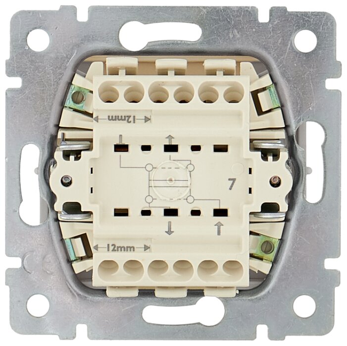 - Одноклавишный перекрестный или перекидной выключатель. Применяется в качестве промежуточного устройства в цепи из трех и более местоположений.